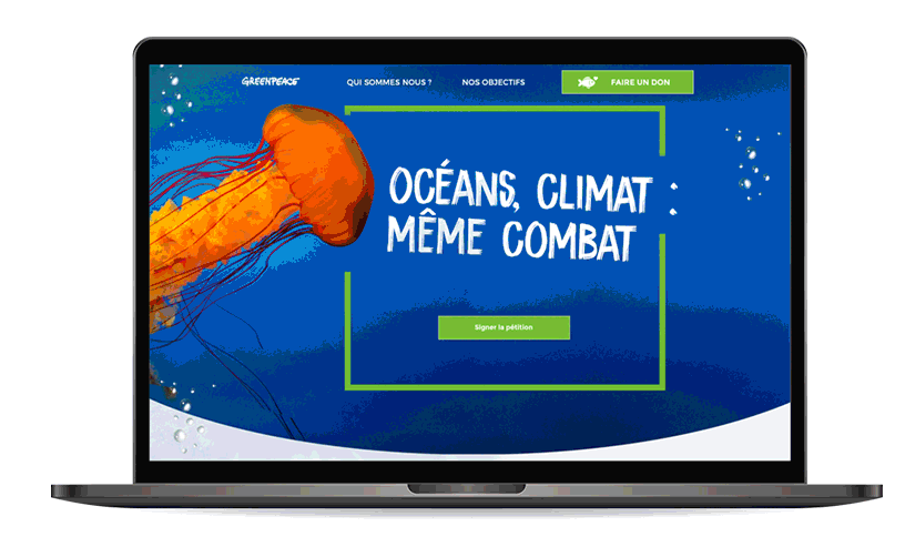 Green Peace est une association a respecter pour son combat et c’est la raison pour laquelle j’ai eu l’envie de travailler sur des pages immersives mettant en avant l’océan par exemple pour sensibiliser à la cause mais aussi pour pousser au don. Pour cela, j’ai choisis de rendre le tunnel de don le plus attrayant possible via des photos et des dégradés de couleurs.