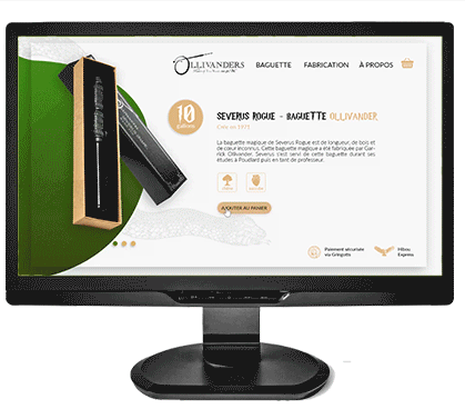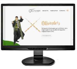 Bien que le design soit très moderne, je me suis amusé a créer un site e-commerce pour la boutique Ollivanders de Harry Potter en imaginant que les clients achètent en fonction de leur maison et donc avec le code couleur correspondant. J’aimerai un jour reprendre ce projet pour tenter de suivre un peu plus la charte de l’univers d’Harry Potter, bien que cela soit complexe J’avais même créer un filtre facebook a thème.