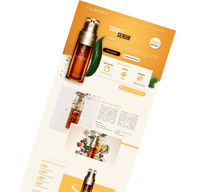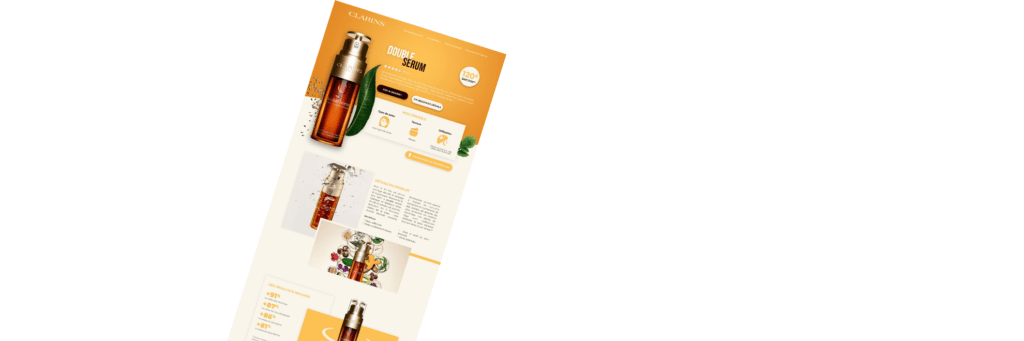 Clarins proposait un nouveau produit, doublé sérum et j’ai trouvé intéréssant de travailler sur une page dédiée a ce produit pour tenter de mettre en avant ses arguments de vente en respectant la charte du packaging et l’image globale « naturelle » du produit.