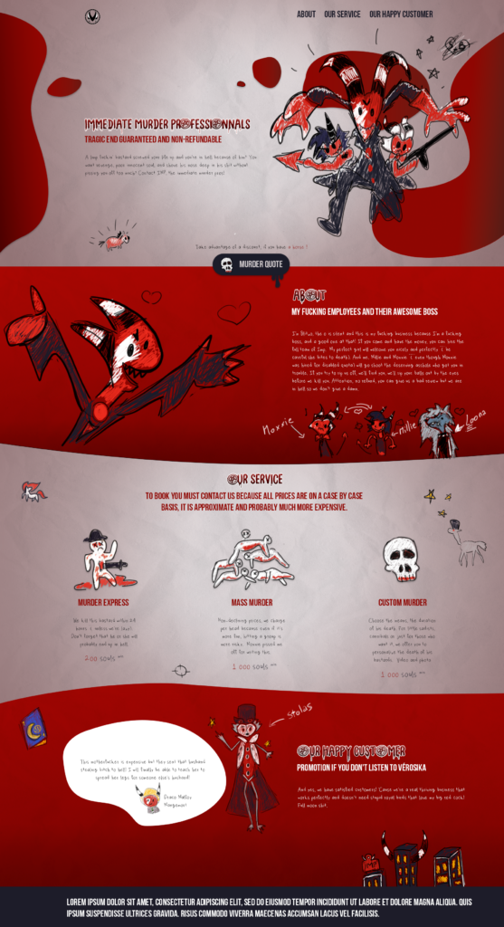 Ce site est un site humoristique dédiée a un série produite par le studio Vizievipop nommé Helluva Boss. Il s’agit du site créer par Blitzø pour représenter Imp (immediate murder professionnal), un site e-commerce proposant les services de meurtre de la société via plusieurs formules. J’ai essayé de reprendre le style artistique du dirigeant de imp pour être dans le thème.