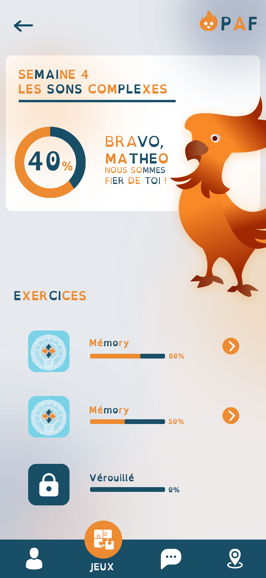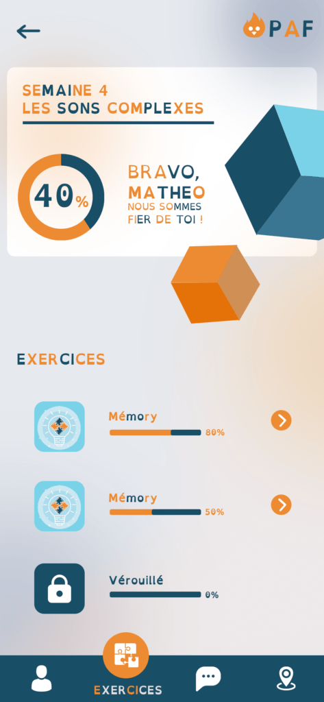 Paf est une application dédiée aux personnes souffrant de dys, l’idée est de stimuler selon le besoin du patient la personne atteinte pour lui permettre de s’améliorer plus rapidement. Le projet est de diminuer le nombre de séance nécéssaire pour aider un patient, d’augmenter l»efficacité des scéances pour pallier au manquer d’orthophoniste en France. Sa mascotte a été créer dans une idée de renouveau mais aussi s’amuser l’utilisateur en utilisant la personnification.